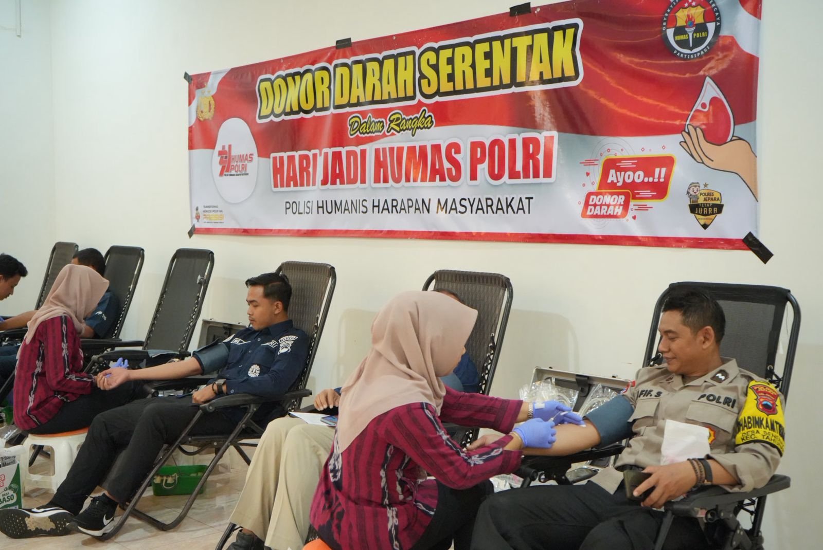 Kepolisian Resor (Polres) Jepara, Polda Jawa Tengah, menggelar kegiatan donor darah dalam rangka memperingati Hari Ulang Tahun (HUT) ke-74 Humas Polri di aula Kartini KPP Pratama Jepara, pada Rabu (22/10/2025).