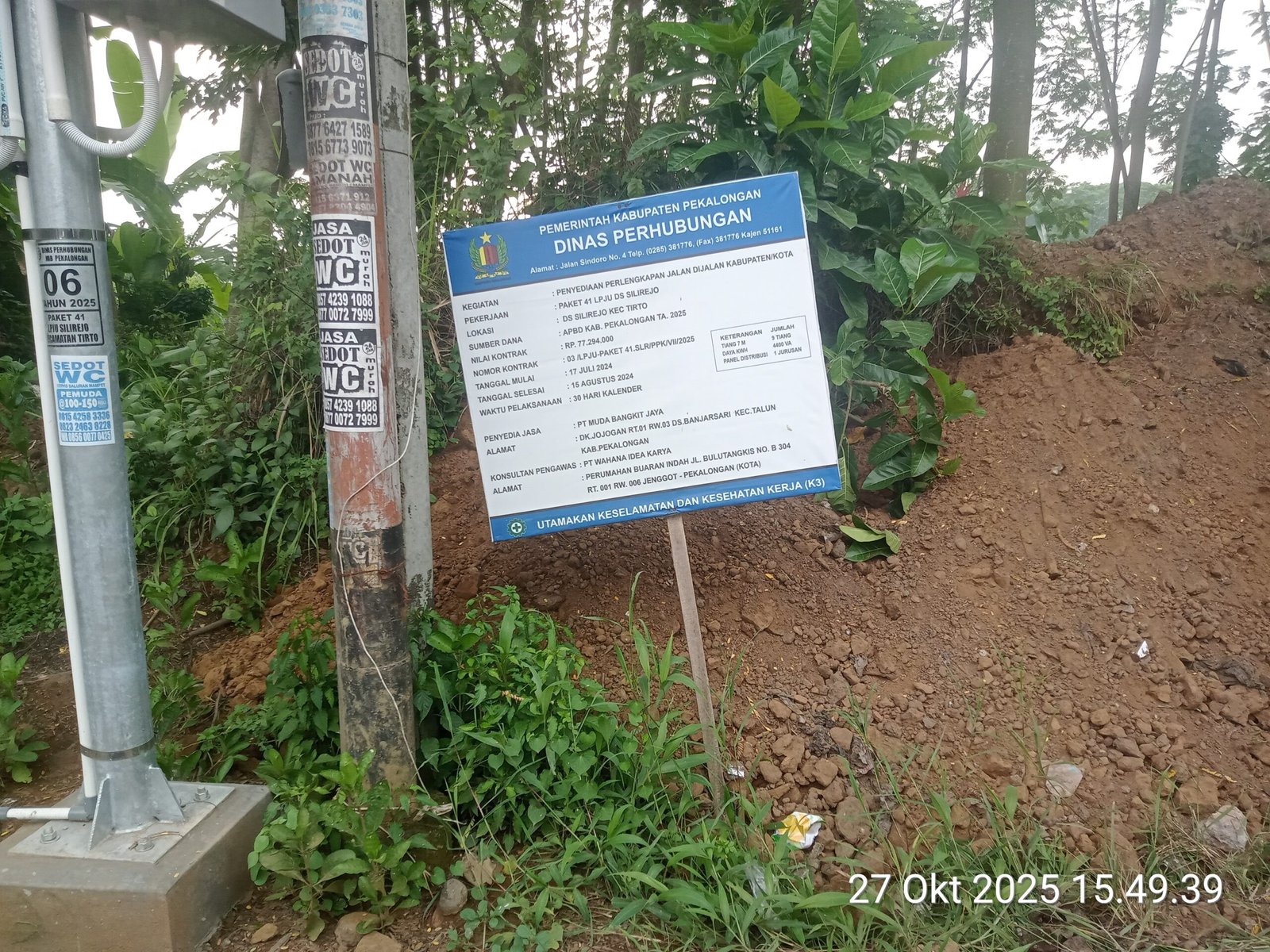 Berdasarkan informasi yang tercantum pada papan proyek, kegiatan ini adalah bagian dari Kegiatan : Penyediaan Perlengkapan Jalan, di Jalan Kabupaten/Kota. Pekerjaan : Pemasangan Lampu Penerang Jalan Umum di Desa Silirejo (paket 41 LPJU) dengan Nilai Kontrak : Rp77.294.000,00. Sumber Anggaran : APBD Kabupaten Pekalongan Tahun Anggaran (TA) 2025. Bernomor Kontrak : 03/LPJU-PAKET 41.SLR/PPK/VI/2025 pelaksana atau Penyedia Jasa : dari PT Muda Bangkit Jaya yang beralamat di Dk. Jojogan RT. 01/03 DS. Banjarsari Kecamatan Talun, Kabupaten Pekalongan kegiatan tersebut di awasi oleh Konsultan Pengawas : PT Wahana Idea Karya yang beralamat di Perumahan Buaran Indah Jenggot Pekalongan Kota,